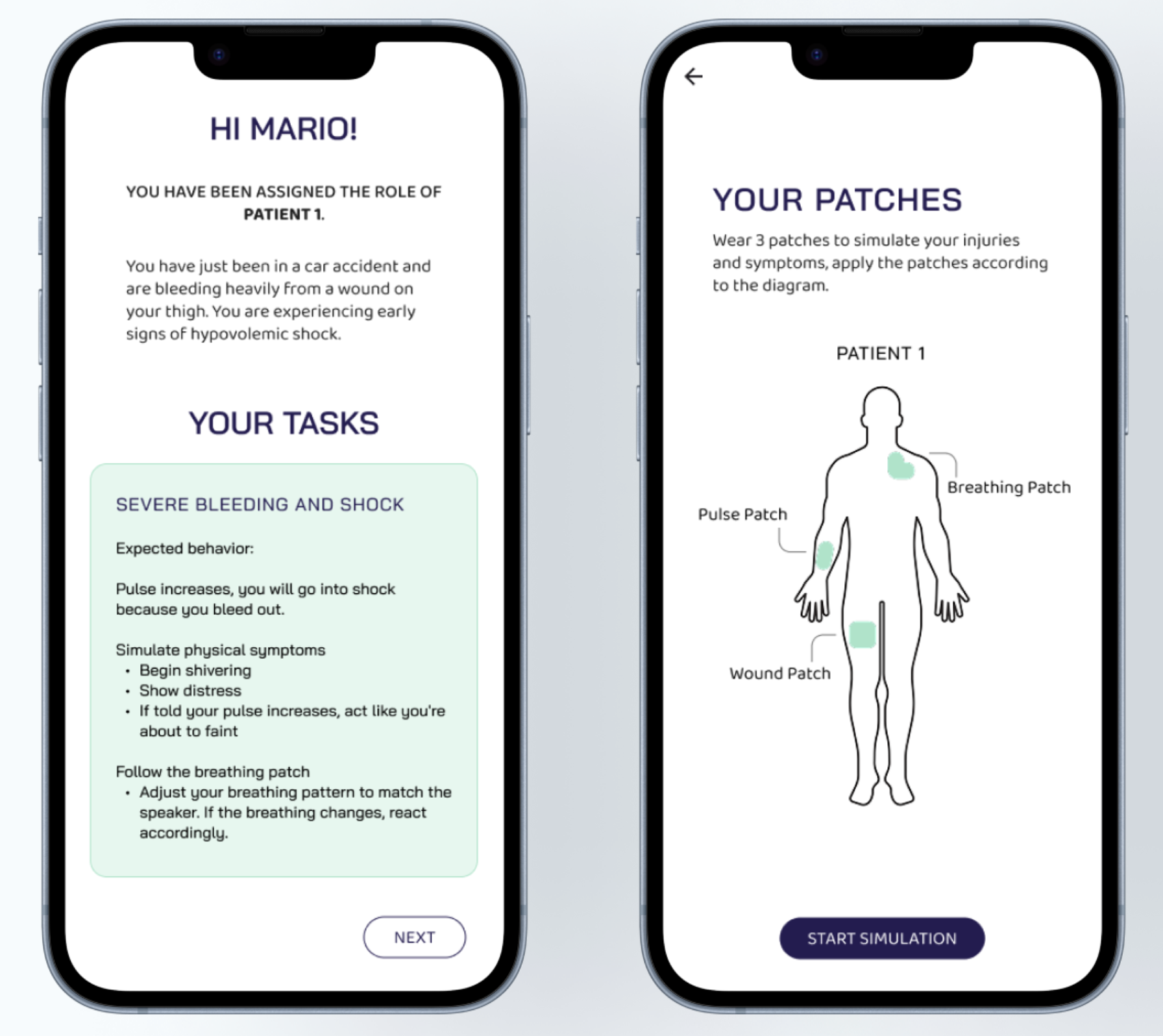 We developed QUE, which are wearable simulation stickers providing realistic, interactive scenarios for paramedics.